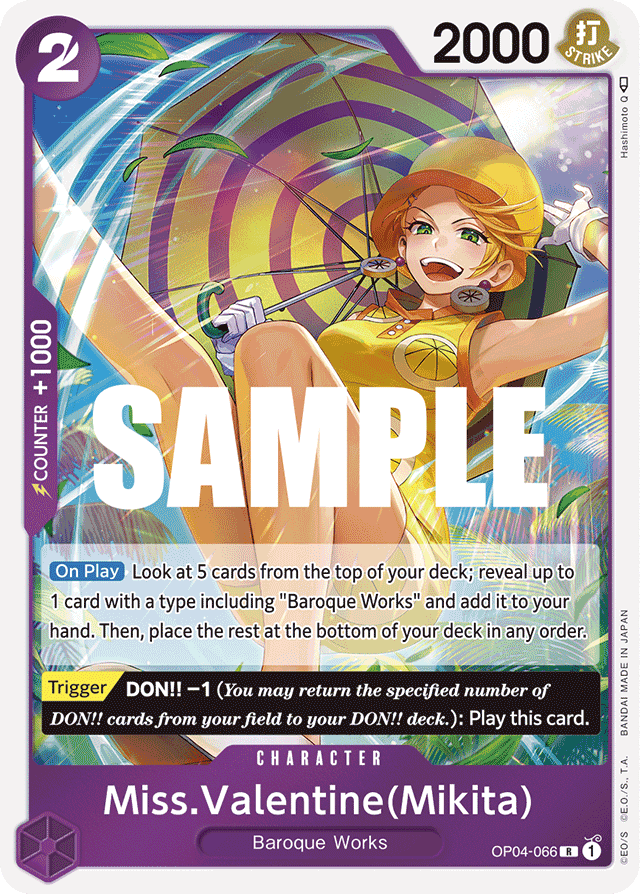 [On Play] Look at 5 cards from the top of your deck; reveal up to 1 card with a type including "Baroque Works" and add it to your hand. Then, place the rest at the bottom of your deck in any order. [Trigger] DON!! −1 (You may return the specified number of DON!! cards from your field to your DON!! deck.): Play this card.