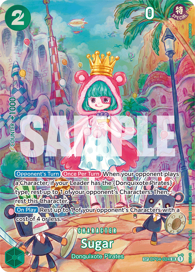 [Opponent's Turn] [Once Per Turn] When your opponent plays a Character, if your Leader has the {Donquixote Pirates} type, rest up to 1 of your opponent's Characters. Then, rest this Character. [On Play] Rest up to 1 of your opponent's Characters with a cost of 4 or less.