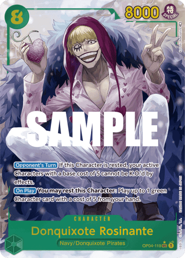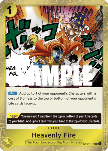 [Main] Choose up to 1 of your opponent's Characters with a cost of 4 or less and K.O. it. If you have 15 or more cards in your trash, choose up to 1 of your opponent's Characters with a cost of 6 or less instead of a Character with a cost of 4 or less. [Trigger] You may rest your Leader: K.O. up to 1 of your opponent's Characters with a cost of 5 or less.