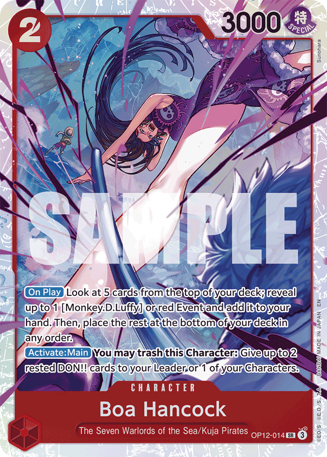 [On Play] Look at 5 cards from the top of your deck; reveal up to 1 [Monkey.D.Luffy] or red Event and add it to your hand. Then, place the rest at the bottom of your deck in any order. [Activate: Main] You may trash this Character: Give up to 2 rested DON!! cards to your Leader or 1 of your Characters.