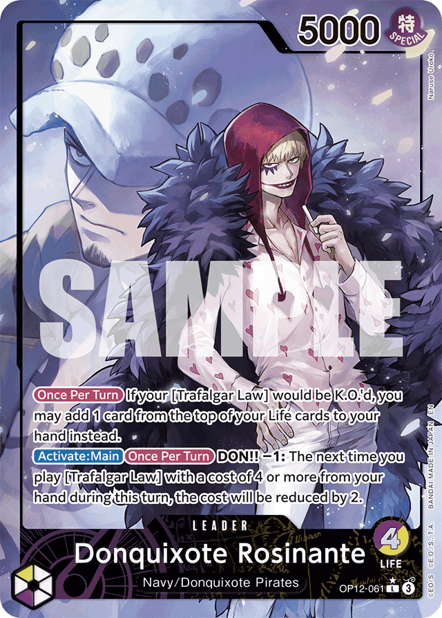 [Once Per Turn] If your [Trafalgar Law] would be K.O.'d, you may add 1 card from the top of your Life cards to your hand instead. [Activate: Main] [Once Per Turn] DON!! −1: The next time you play [Trafalgar Law] with a cost of 4 or more from your hand during this turn, the cost will be reduced by 2.