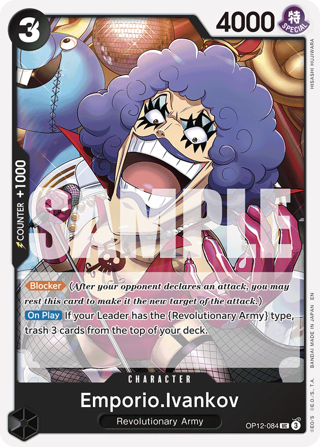 [Blocker] (After your opponent declares an attack, you may rest this card to make it the new target of the attack.) [On Play] If your Leader has the {Revolutionary Army} type, trash 3 cards from the top of your deck.