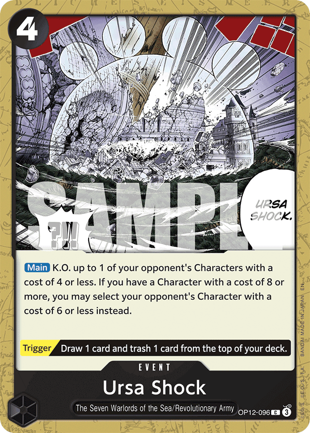 [Main] K.O. up to 1 of your opponent's Characters with a cost of 4 or less. If you have a Character with a cost of 8 or more, you may select your opponent's Character with a cost of 6 or less instead. [Trigger] Draw 1 card and trash 1 card from the top of your deck.