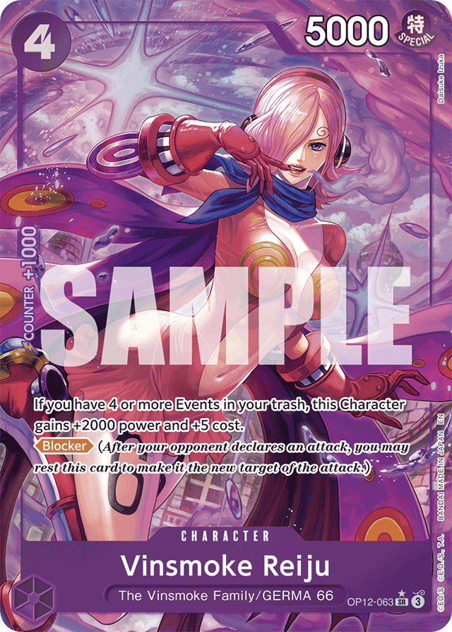 If you have 4 or more Events in your trash, this Character gains +2000 power and +5 cost. [Blocker] (After your opponent declares an attack, you may rest this card to make it the new target of the attack.)
