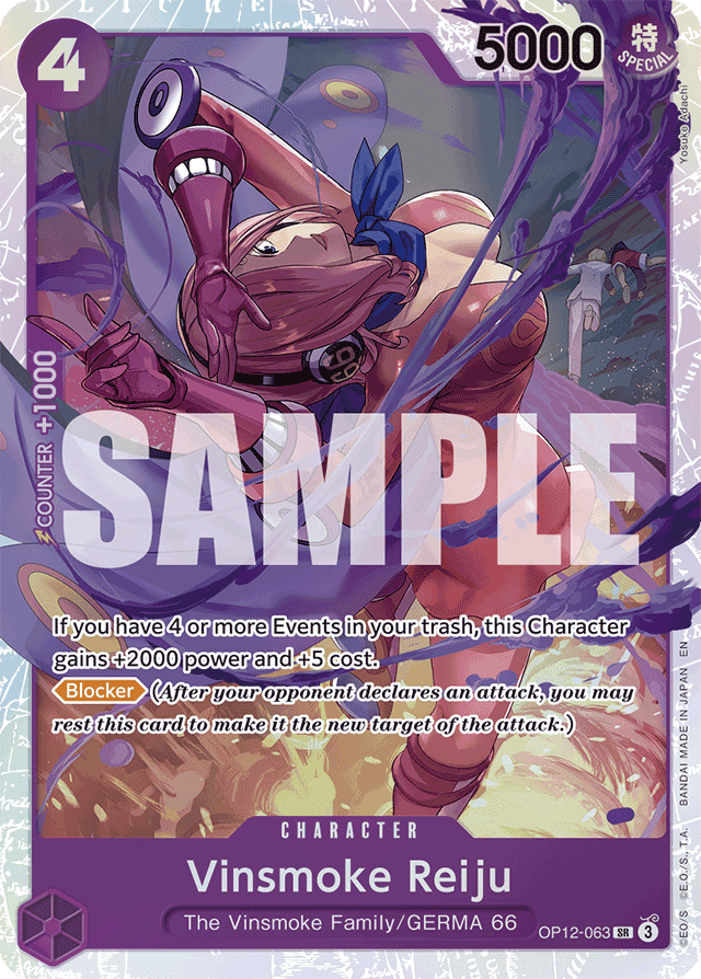 If you have 4 or more Events in your trash, this Character gains +2000 power and +5 cost. [Blocker] (After your opponent declares an attack, you may rest this card to make it the new target of the attack.)