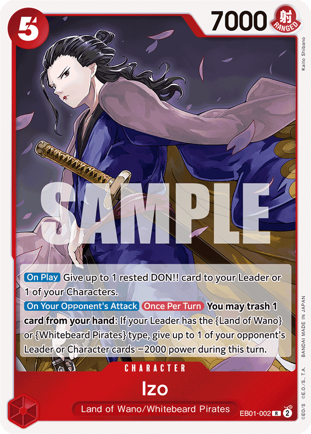 [On Play] Give up to 1 rested DON!! card to your Leader or 1 of your Characters. [On Your Opponent's Attack] [Once Per Turn] You may trash 1 card from your hand: If your Leader has the {Land of Wano} or {Whitebeard Pirates} type, give up to 1 of your opponent's Leader or Character cards −2000 power during this turn.