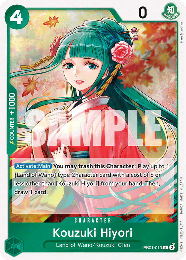 [Activate: Main] You may trash this Character: Play up to 1 {Land of Wano} type Character card with a cost of 5 or less other than [Kouzuki Hiyori] from your hand. Then, draw 1 card.