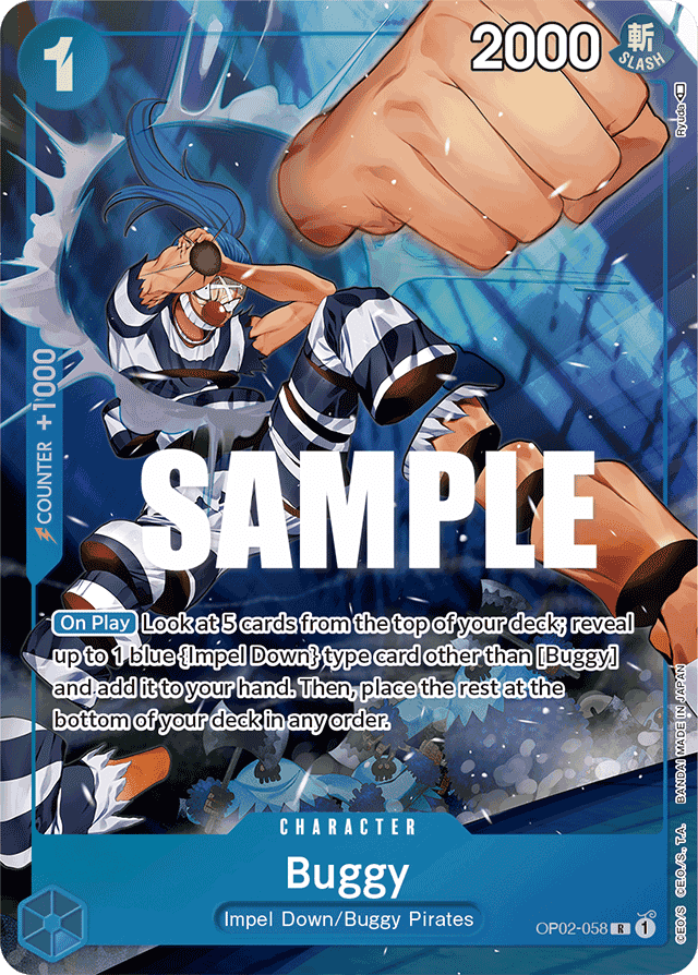[On Play] Look at 5 cards from the top of your deck; reveal up to 1 blue {Impel Down} type card other than [Buggy] and add it to your hand. Then, place the rest at the bottom of your deck in any order.