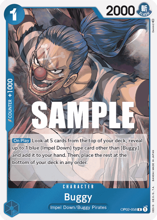 [On Play] Look at 5 cards from the top of your deck; reveal up to 1 blue {Impel Down} type card other than [Buggy] and add it to your hand. Then, place the rest at the bottom of your deck in any order.