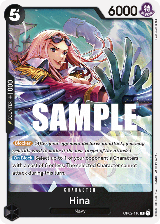 [Blocker] (After your opponent declares an attack, you may rest this card to make it the new target of the attack.) [On Block] Select up to 1 of your opponent's Characters with a cost of 6 or less. The selected Character cannot attack during this turn.
