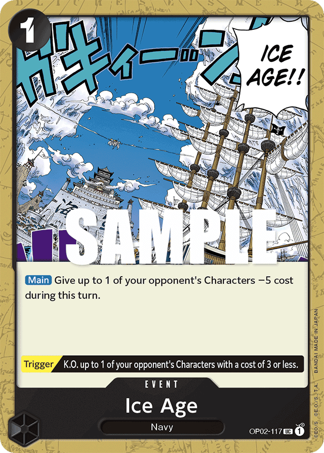 [Main] Give up to 1 of your opponent's Characters ?5 cost during this turn. [Trigger] K.O. up to 1 of your opponent's Characters with a cost of 3 or less.