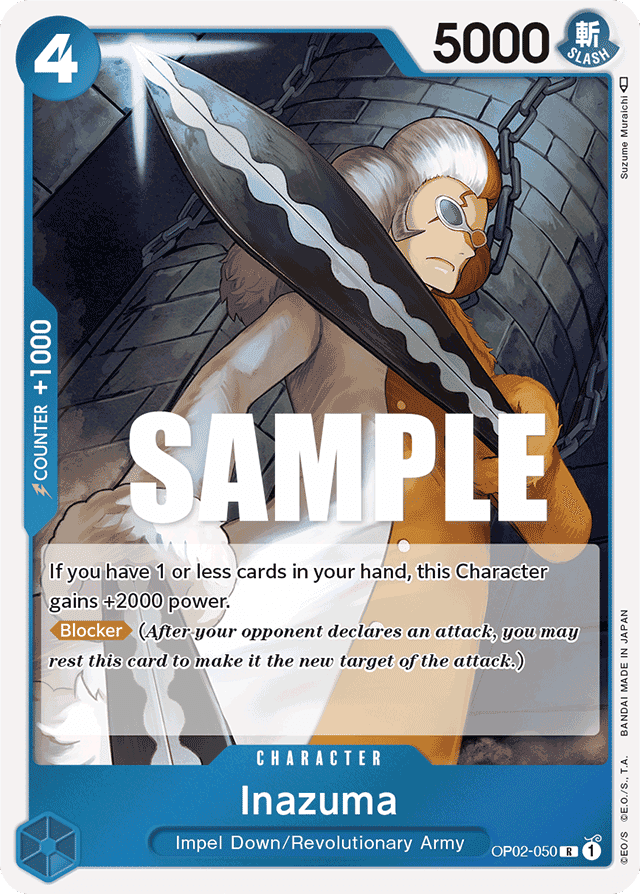 If you have 1 or less cards in your hand, this Character gains +2000 power. [Blocker] (After your opponent declares an attack, you may rest this card to make it the new target of the attack.)