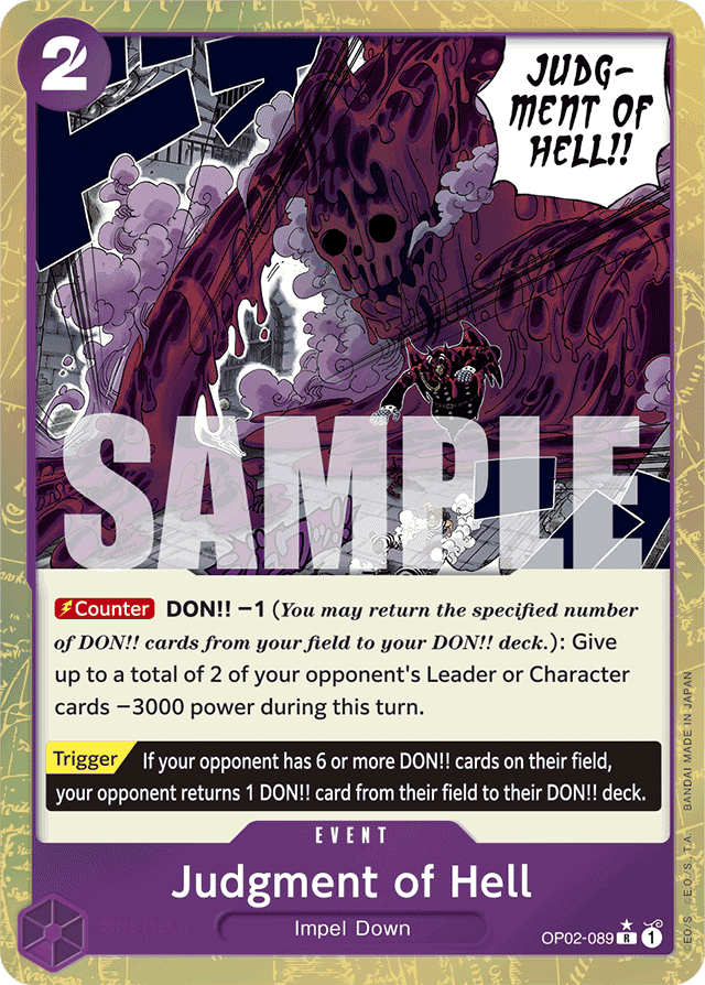 [Counter] DON!! ?1 (You may return the specified number of DON!! cards from your field to your DON!! deck.): Give up to a total of 2 of your opponent's Leader or Character cards ?3000 power during this turn. [Trigger] If your opponent has 6 or more DON!! cards on their field, your opponent returns 1 DON!! card from their field to their DON!! deck.