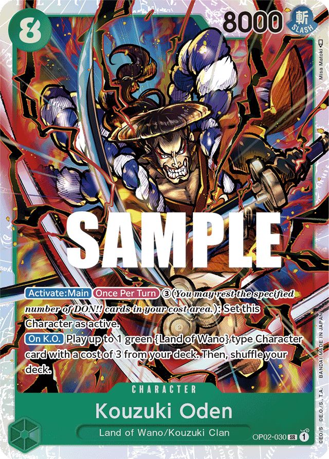 [Activate: Main] [Once Per Turn] ③ (You may rest the specified number of DON!! cards in your cost area.): Set this Character as active. [On K.O.] Play up to 1 green {Land of Wano} type Character card with a cost of 3 from your deck. Then, shuffle your deck.