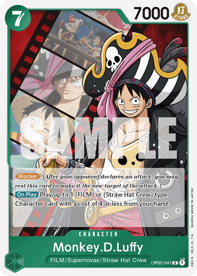 [Blocker] (After your opponent declares an attack, you may rest this card to make it the new target of the attack.) [On Play] Play up to 1 {FILM} or {Straw Hat Crew} type Character card with a cost of 4 or less from your hand.