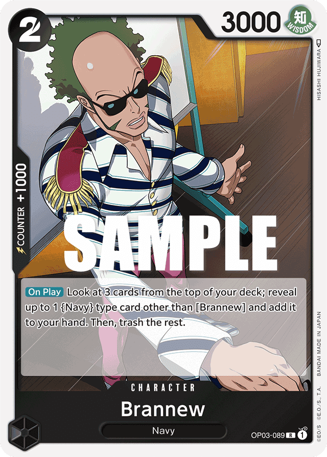 [On Play] Look at 3 cards from the top of your deck; reveal up to 1 {Navy} type card other than [Brannew] and add it to your hand. Then, trash the rest.