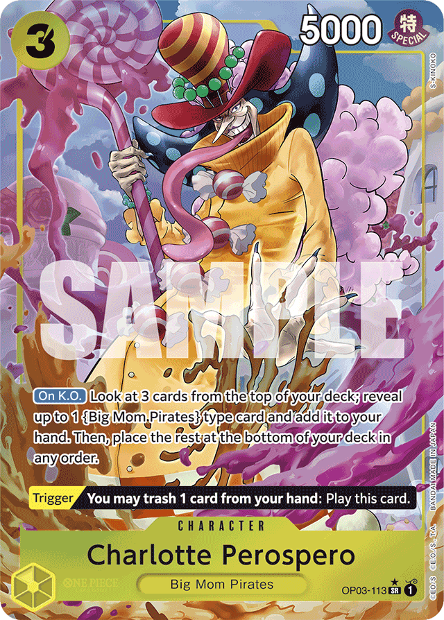 [On K.O.] Look at 3 cards from the top of your deck; reveal up to 1 {Big Mom Pirates} type card and add it to your hand. Then, place the rest at the bottom of your deck in any order. [Trigger] You may trash 1 card from your hand: Play this card.