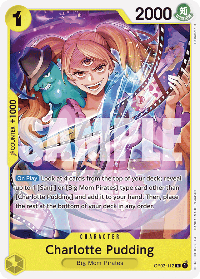 [On Play] Look at 4 cards from the top of your deck; reveal up to 1 [Sanji] or {Big Mom Pirates} type card other than [Charlotte Pudding] and add it to your hand. Then, place the rest at the bottom of your deck in any order.