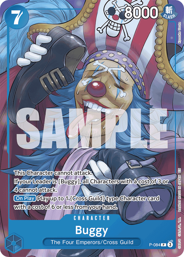 This Character cannot attack.If your Leader is [Buggy], all Characters with a cost of 3 or 4 cannot attack. [On Play] Play up to 1 {Cross Guild} type Character card with a cost of 6 or less from your hand.