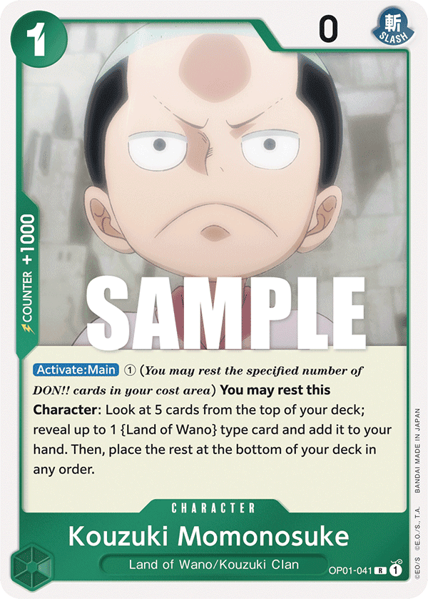 [Activate: Main] ➀ (You may rest the specified number of DON!! cards in your cost area) You may rest this Character: Look at 5 cards from the top of your deck; reveal up to 1 {Land of Wano} type card and add it to your hand. Then, place the rest at the bottom of your deck in any order.