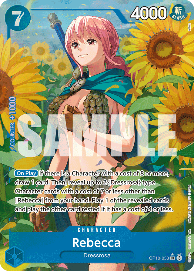 [On Play] If there is a Character with a cost of 8 or more, draw 1 card. Then, reveal up to 2 {Dressrosa} type Character cards with a cost of 7 or less other than [Rebecca] from your hand. Play 1 of the revealed cards and play the other card rested if it has a cost of 4 or less.