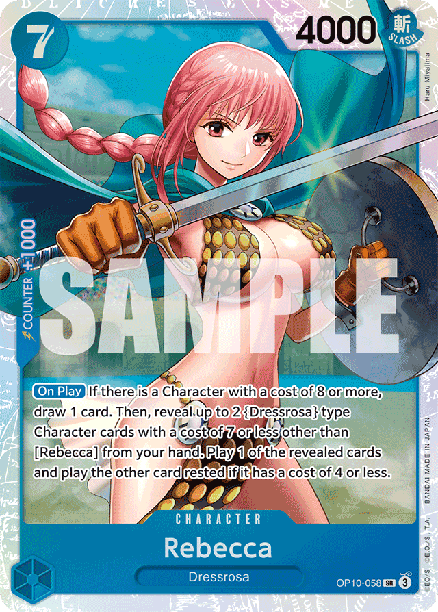 [On Play] If there is a Character with a cost of 8 or more, draw 1 card. Then, reveal up to 2 {Dressrosa} type Character cards with a cost of 7 or less other than [Rebecca] from your hand. Play 1 of the revealed cards and play the other card rested if it has a cost of 4 or less.