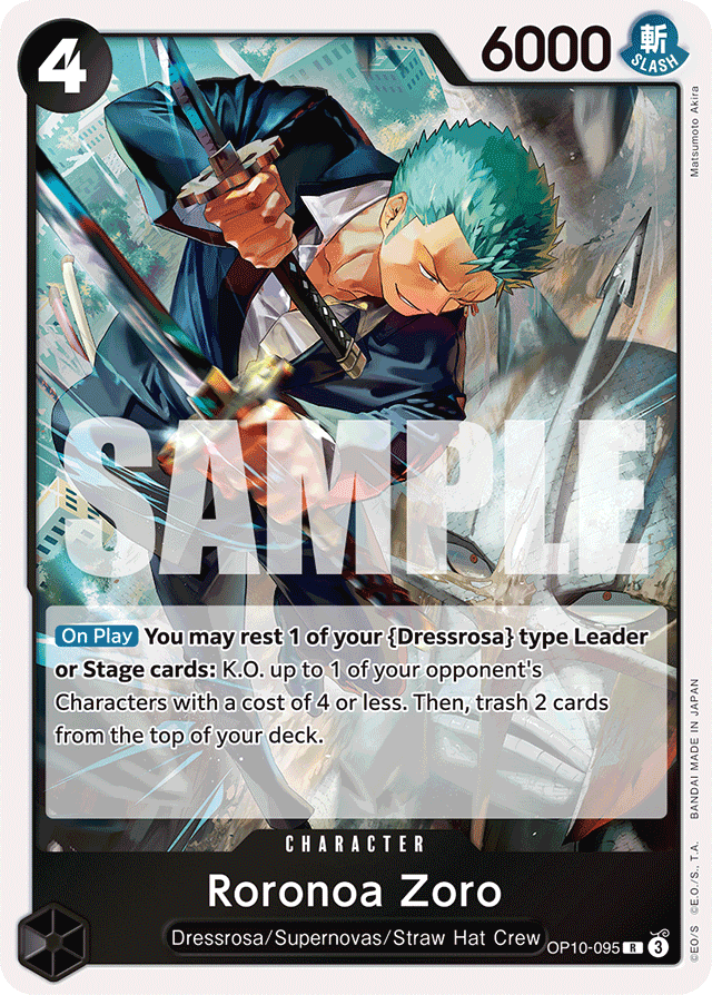 [On Play] You may rest 1 of your {Dressrosa} type Leader or Stage cards: K.O. up to 1 of your opponent's Characters with a cost of 4 or less. Then, trash 2 cards from the top of your deck.