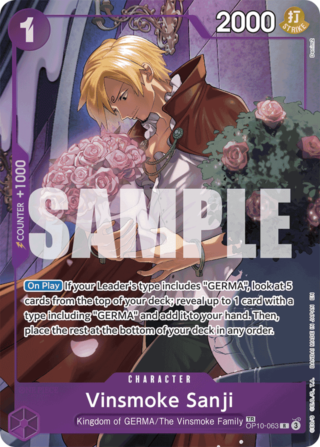 [On Play] If your Leader's type includes "GERMA", look at 5 cards from the top of your deck; reveal up to 1 card with a type including "GERMA" and add it to your hand. Then, place the rest at the bottom of your deck in any order.