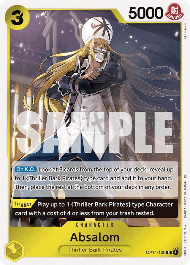 [On K.O.] Look at 3 cards from the top of your deck; reveal up to 1 {Thriller Bark Pirates} type card and add it to your hand. Then, place the rest at the bottom of your deck in any order. [Trigger] Play up to 1 {Thriller Bark Pirates} type Character card with a cost of 4 or less from your trash rested.