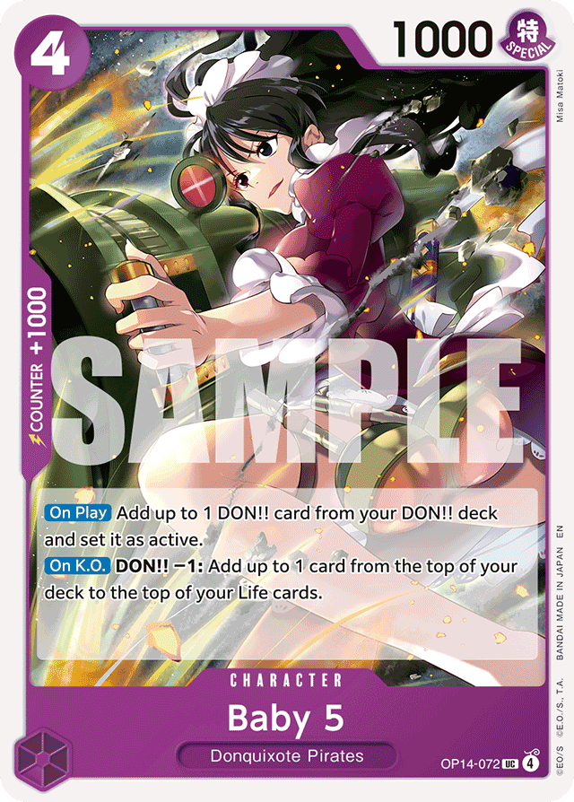 [On Play] Add up to 1 DON!! card from your DON!! deck and set it as active. [On K.O.] DON!! −1: Add up to 1 card from the top of your deck to the top of your Life cards.