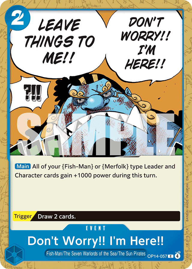 [Main] All of your Leader and Characters with a type including {Fish-Man} or {Merfolk} gain +1000 power during this turn. [Trigger] Draw 2 cards.