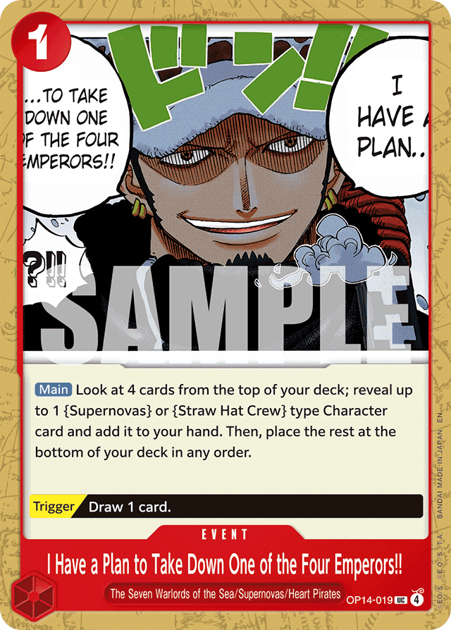 [Main] Look at 4 cards from the top of your deck; reveal up to 1 {Supernovas} or {Straw Hat Crew} type Character card and add it to your hand. Then, place the rest at the bottom of your deck in any order. [Trigger] Draw 1 card.