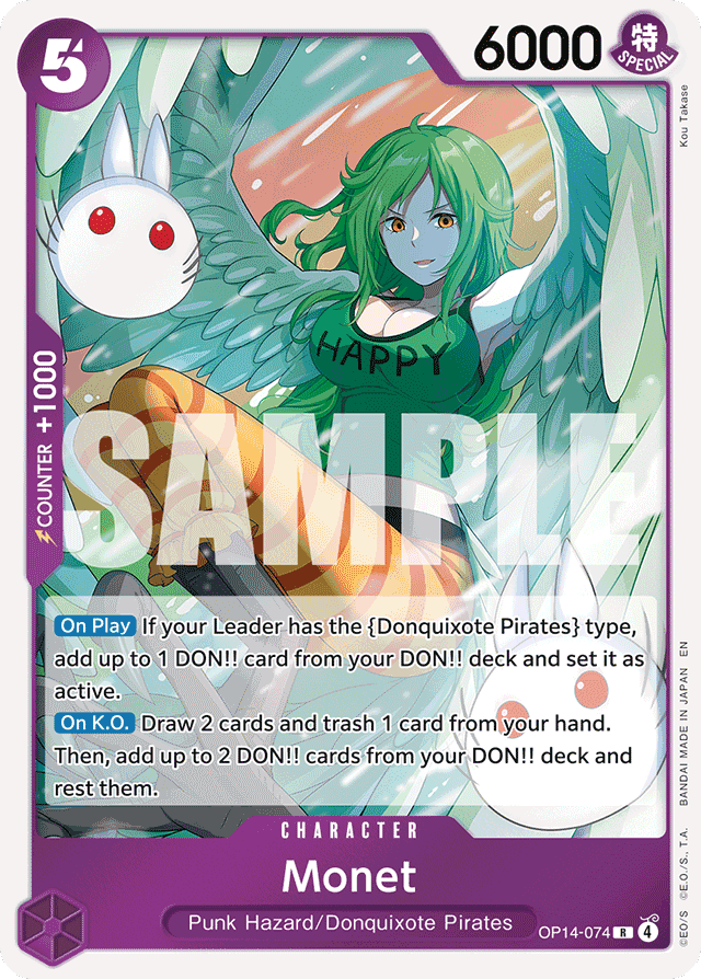 [On Play] If your Leader has the {Donquixote Pirates} type, add up to 1 DON!! card from your DON!! deck and set it as active. [On K.O.] Draw 2 cards and trash 1 card from your hand. Then, add up to 2 DON!! cards from your DON!! deck in rest.
