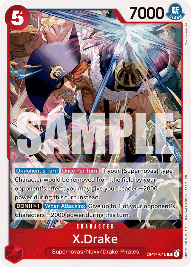 [Opponent's Turn] [Once Per Turn] If your Character with the {Supernovas} trait would leave the field due to an opponent's effect, you may instead give your Leader −2000 power during this turn. [DON!! x1] [When Attacking] Give up to 1 of your opponent's Characters −2000 power during this turn.