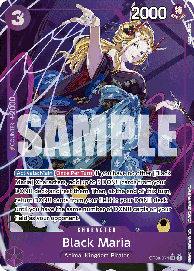 [Activate: Main] [Once Per Turn] If you have no other [Black Maria] Characters, add up to 5 DON!! cards from your DON!! deck and rest them. Then, at the end of this turn, return DON!! cards from your field to your DON!! deck until you have the same number of DON!! cards on your field as your opponent.