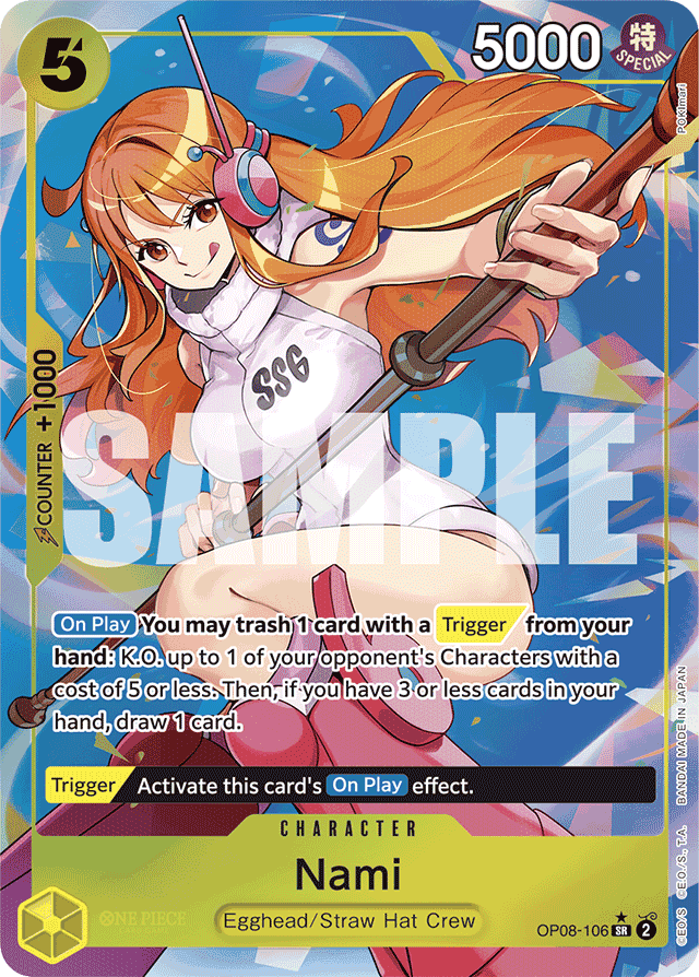 [On Play] You may trash 1 card with a [Trigger] from your hand: K.O. up to 1 of your opponent's Characters with a cost of 5 or less. Then, if you have 3 or less cards in your hand, draw 1 card. [Trigger] Activate this card's [On Play] effect.