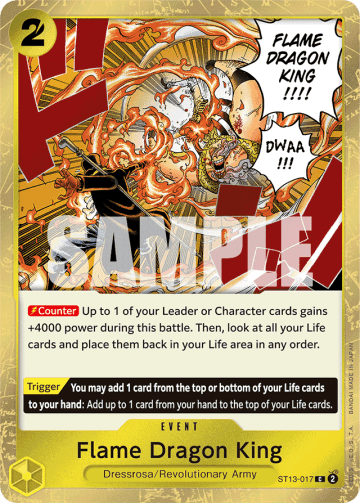 [Blocker] (After your opponent declares an attack, you may rest this card to make it the new target of the attack.) [On Play] You may trash 1 card from the top or bottom of your Life cards: Reveal up to 1 Character card with a cost of 5 from your hand and add it to the top of your Life cards face-down.
