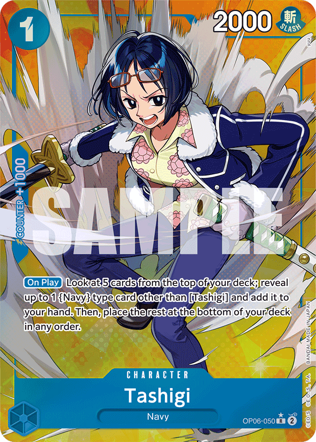 [On Play] Look at 5 cards from the top of your deck; reveal up to 1 {Navy} type card other than [Tashigi] and add it to your hand. Then, place the rest at the bottom of your deck in any order.