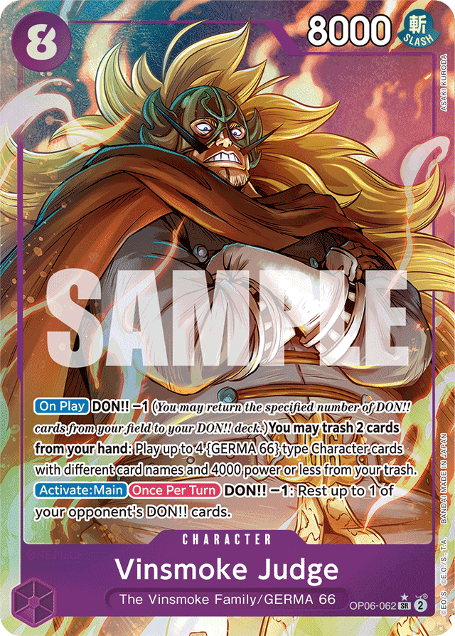 [On Play] DON!! −1 (You may return the specified number of DON!! cards from your field to your DON!! deck.) You may trash 2 cards from your hand: Play up to 4 {GERMA 66} type Character cards with different card names and 4000 power or less from your trash. [Activate: Main] [Once Per Turn] DON!! −1: Rest up to 1 of your opponent's DON!! cards.
