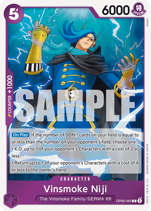[On Play] If the number of DON!! cards on your field is equal to or less than the number on your opponent's field, choose one:• K.O. up to 1 of your opponent's Characters with a cost of 2 or less.• Return up to 1 of your opponent's Characters with a cost of 4 or less to the owner's hand.