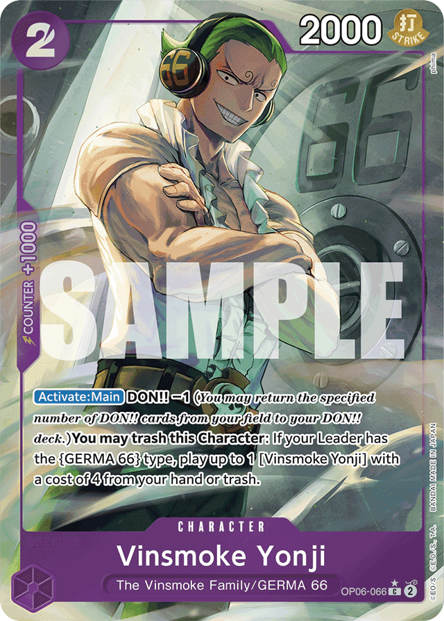 [Activate: Main] DON!! −1 (You may return the specified number of DON!! cards from your field to your DON!! deck.) You may trash this Character: If your Leader has the {GERMA 66} type, play up to 1 [Vinsmoke Yonji] with a cost of 4 from your hand or trash.
