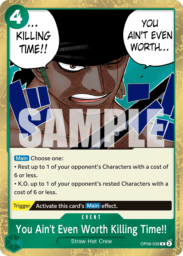 [Main] Choose one:• Rest up to 1 of your opponent's Characters with a cost of 6 or less.• K.O. up to 1 of your opponent's rested Characters with a cost of 6 or less. [Trigger] Activate this card's [Main] effect.