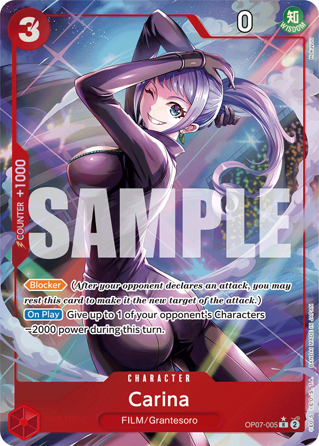 [Blocker] (After your opponent declares an attack, you may rest this card to make it the new target of the attack.) [On Play] Give up to 1 of your opponent's Characters −2000 power during this turn.