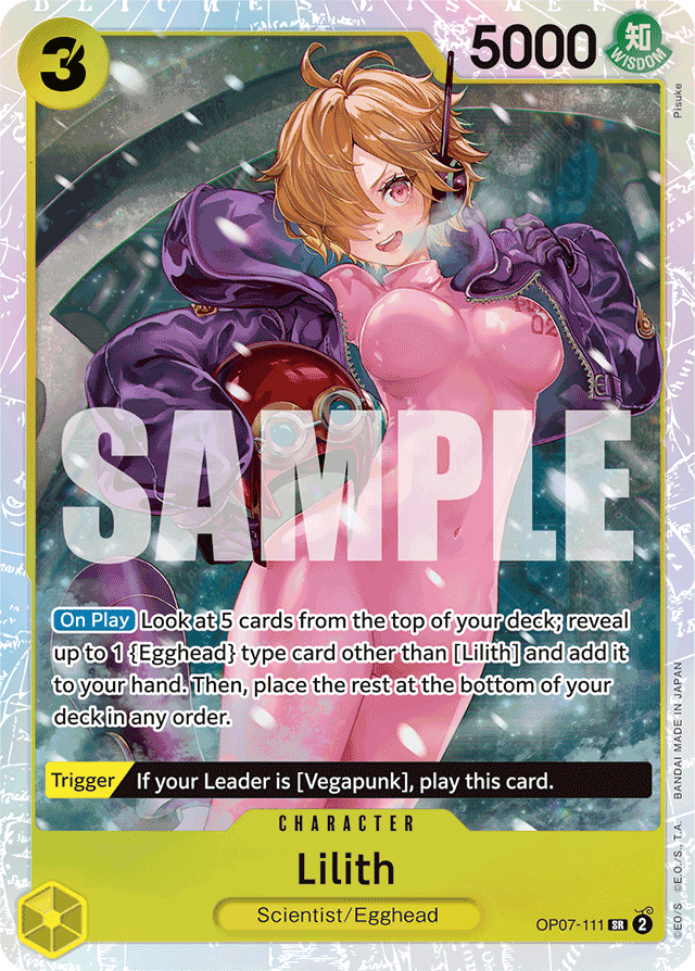 [On Play] Look at 5 cards from the top of your deck; reveal up to 1 {Egghead} type card other than [Lilith] and add it to your hand. Then, place the rest at the bottom of your deck in any order. [Trigger] If your Leader is [Vegapunk], play this card.