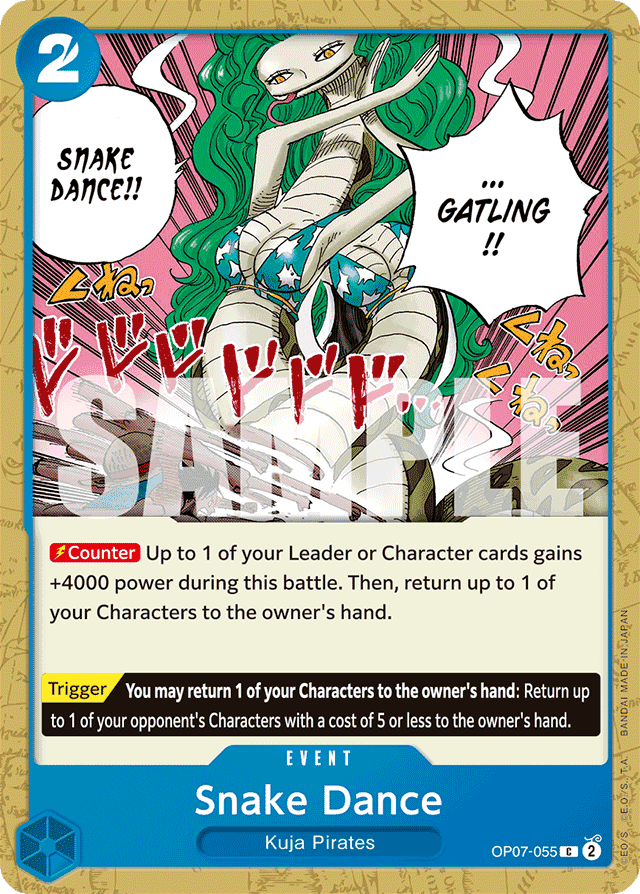 [Counter] Up to 1 of your Leader or Character cards gains +4000 power during this battle. Then, return up to 1 of your Characters to the owner's hand. [Trigger] You may return 1 of your Characters to the owner's hand: Return up to 1 of your opponent's Characters with a cost of 5 or less to the owner's hand.