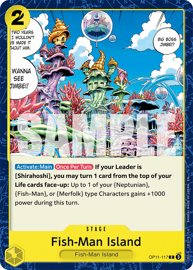 [Activate: Main] [Once Per Turn] If your Leader is [Shirahoshi], you may turn 1 card from the top of your Life cards face-up: Up to 1 of your {Neptunian}, {Fish-Man}, or {Merfolk} type Characters gains +1000 power during this turn.
