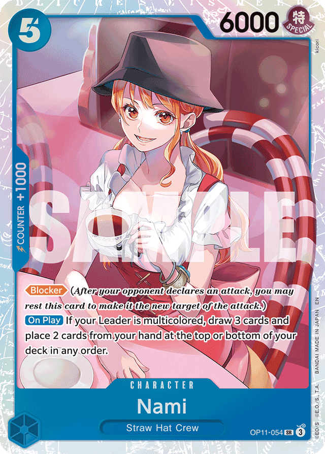 [Blocker] (After your opponent declares an attack, you may rest this card to make it the new target of the attack.) [On Play] If your Leader is multicolored, draw 3 cards and place 2 cards from your hand at the top or bottom of your deck in any order.