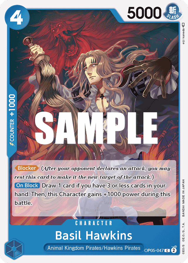 [Blocker] (After your opponent declares an attack, you may rest this card to make it the new target of the attack.) [On Block] Draw 1 card if you have 3 or less cards in your hand. Then, this Character gains +1000 power during this battle.