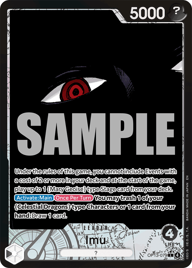 Under the rules of this game, you cannot include Events with a cost of 2 or more in your deck and at the start of the game, play up to 1 {Mary Geoise} type Stage card from your deck. [Activate: Main] [Once Per Turn] You may trash 1 of your {Celestial Dragons} type Characters or 1 card from your hand: Draw 1 card.