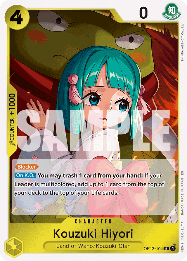 [Blocker] [On K.O.] You may trash 1 card from your hand: If your Leader is multicolored, add up to 1 card from the top of your deck to the top of your Life cards.